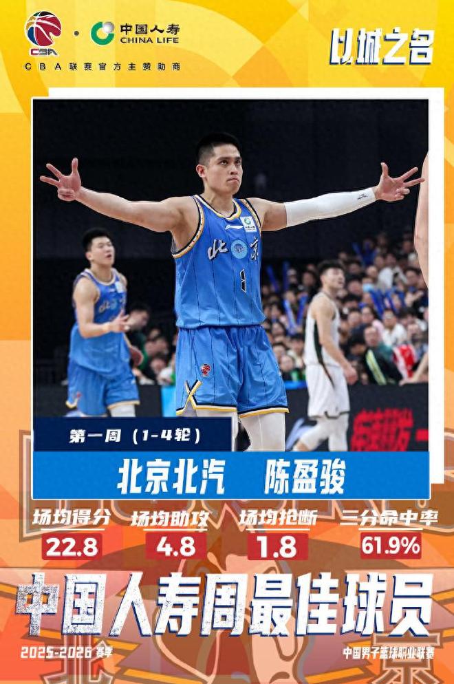CBA官宣,陳盈駿當(dāng)選2025-2026賽季CBA聯(lián)賽常規(guī)賽第一周周最佳球員。