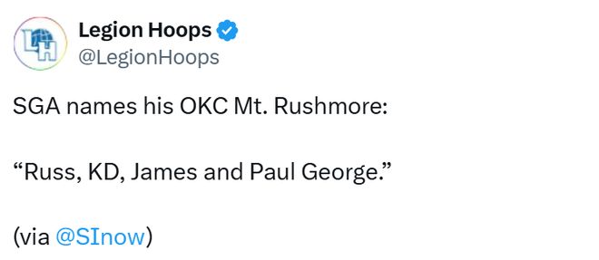 北京時(shí)間1月4日,在接受《體育畫報(bào)》節(jié)目采訪時(shí),亞歷山大被問(wèn)及俄克拉荷馬城雷霆隊(duì)史“總統(tǒng)山”(即隊(duì)史最偉大的四位球員)人選,他的回答簡(jiǎn)潔且意味深長(zhǎng),幾乎沒(méi)有絲毫猶豫:“威斯布魯