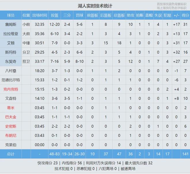 三節(jié)打完,湖人102-86領(lǐng)先16分。第四節(jié)老鷹一度追到11分,詹姆斯三分球幫湖人止血。末節(jié)詹姆斯獨(dú)得12分,最后4分鐘老鷹投子認(rèn)負(fù)。最終湖人141-116大勝老鷹25分。詹姆斯31分9板10助、東契奇27分5板12助、艾頓17分18板。