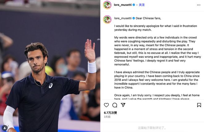 隨后的比賽中,穆塞蒂被現(xiàn)場觀眾狂噓。社交媒體的視頻顯示,部分觀眾更是在穆塞蒂發(fā)球時(shí),故意大聲咳嗽來惡心他。
