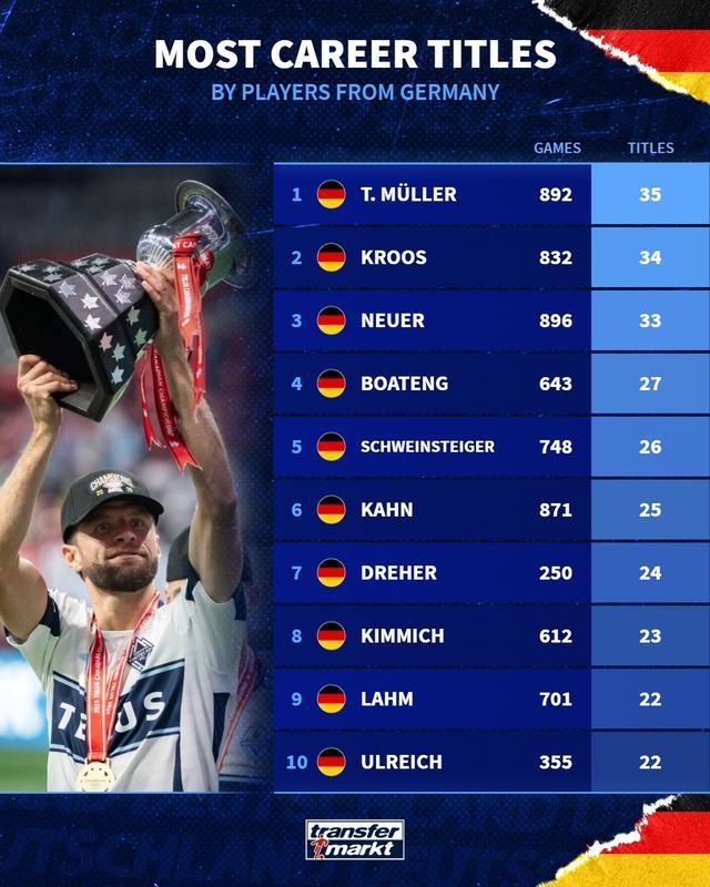 35冠超越克羅斯,穆勒成為奪冠次數(shù)最多的德國球員