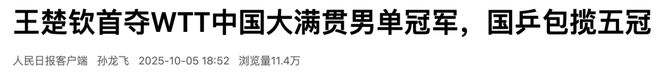 - 10月5日,10月5日,10月5日,WTT中國大滿貫?zāi)袉螞Q賽,王楚欽4-0戰(zhàn)勝F-勒布倫,奪得男單冠軍,成為本屆中國大滿貫三冠王...發(fā)表于: 10-06 14:36