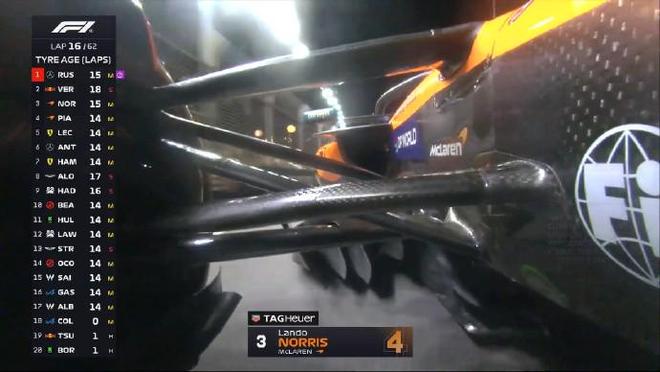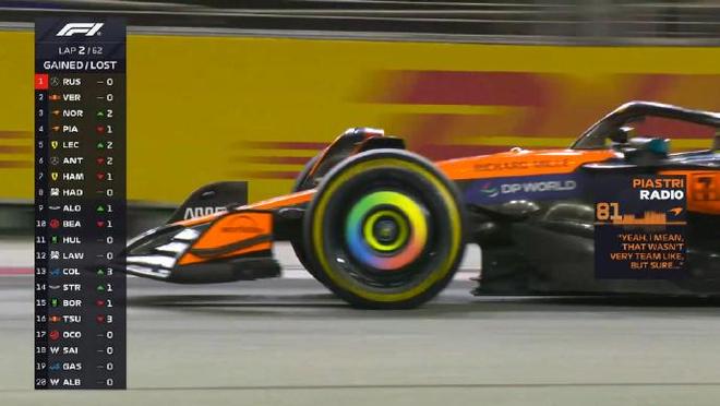 第一圈:諾里斯升至第3,但在和皮亞斯特里的爭奪過程中,諾里斯碰到維斯塔潘,前翼端板受損