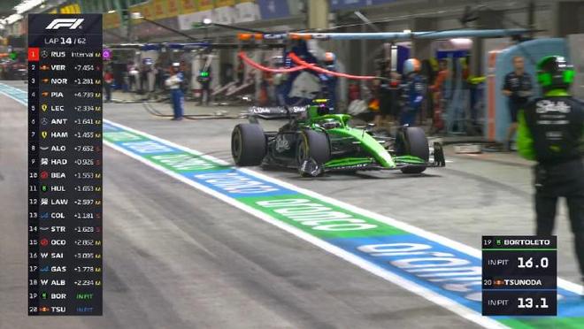第十四圈:博托萊托和角田進站,索伯賽車更換發(fā)車階段和斯托爾碰撞受損的前翼