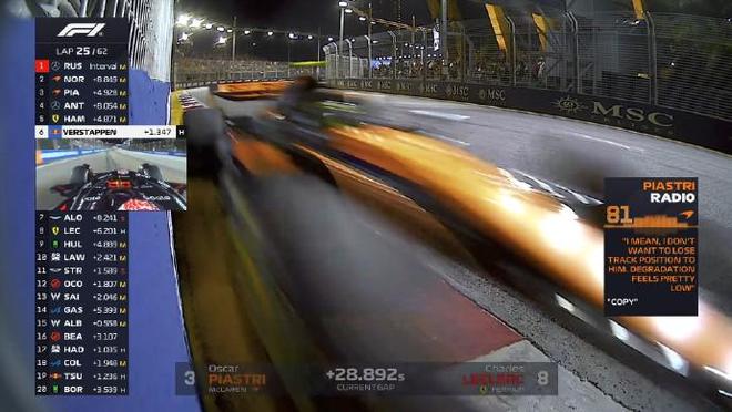 第二十五圈:皮亞斯特里告訴車隊希望用這套中性胎繼續(xù)跑,維斯塔潘追至漢密爾頓身后,法拉利車手進站