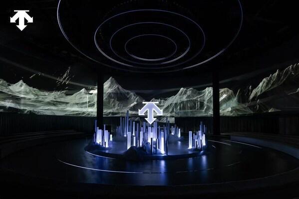 本次"問(wèn)頂未來(lái)"品牌大秀以迪桑特北京華貿(mào)全球旗艦店——"未來(lái)之城"為敘事起點(diǎn),讓建筑本身成為大秀的核心敘事載體。"未來(lái)之城"的設(shè)計(jì)核心源自無(wú)限向前的概念——莫比烏斯環(huán),空間以此為母體,結(jié)合品牌基因化作無(wú)限延展的雪道,營(yíng)造出周行不息的視覺(jué)體驗(yàn)。大秀外場(chǎng)以"未來(lái)雪域"為靈感,圍繞滑手破雪的雪浪意象,打造出冰晶光束與金屬結(jié)構(gòu)交織的光影裝置。這一裝置與建筑立面的莫比烏斯環(huán)相呼應(yīng),科技感與冰雪意象交融,既構(gòu)筑起通往未來(lái)運(yùn)動(dòng)世界的第一視覺(jué)印象,也讓嘉賓未入內(nèi)場(chǎng)便沉浸于品牌營(yíng)造的未來(lái)語(yǔ)境中。