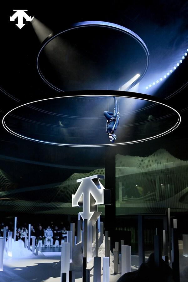 隨著光影點(diǎn)亮象征未來(lái)的時(shí)空之門(mén),"未來(lái)使者"身著未來(lái)感裝備自高空滑入秀場(chǎng),將"未來(lái)之城"轉(zhuǎn)化為立體的冰雪場(chǎng)域。隨著他的落點(diǎn),環(huán)幕之上山峰與雪線被逐一喚醒,仿佛一座真實(shí)雪場(chǎng)被帶入現(xiàn)場(chǎng)。這一幕呼應(yīng)著迪桑特"一切始于滑雪"的品牌基因——滑雪運(yùn)動(dòng)的專業(yè)內(nèi)核早已深植品牌之中,而這場(chǎng)空中演繹,正是對(duì)這份初心的當(dāng)代詮釋,更以動(dòng)感姿態(tài)串聯(lián)起冰雪文化、科技表達(dá)與品牌精神,構(gòu)建起品牌從專業(yè)根基邁向未來(lái)運(yùn)動(dòng)文明的完整視覺(jué)語(yǔ)言。