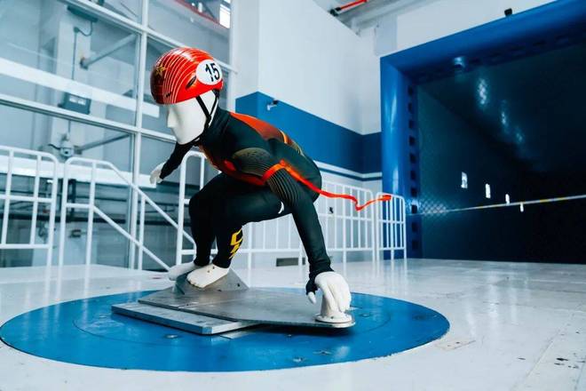 ▲風(fēng)洞測(cè)試中的短道速滑國(guó)家隊(duì)比賽服
