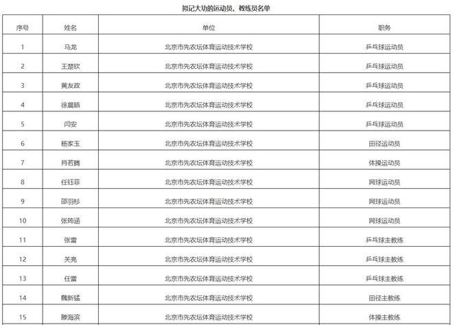 新京報訊 據(jù)體育北京官微消息,在第十五屆全國運動會,北京體育健兒頑強拼搏、團結(jié)協(xié)作,圓滿完成參賽任務(wù),為首都體育事業(yè)再創(chuàng)佳績。依據(jù)《北京市事業(yè)單位工作人員獎勵實施辦法》等文件規(guī)定,市人力資源社會保障局會同市體育局對在第十五屆全國運動會上作出杰出貢獻的北京運動員和教練員,開展記大功獎勵工作。根據(jù)獎勵工作部署,在有關(guān)單位積極推薦的基礎(chǔ)上,經(jīng)綜合評審、統(tǒng)籌考慮,確定北京乒乓球運動隊等9個集體,馬龍等28位同志擬記大功對象。