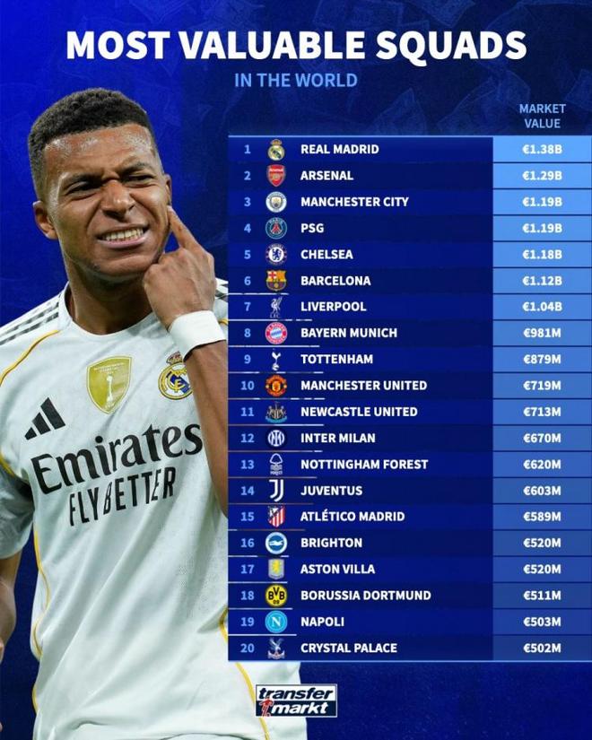 德轉(zhuǎn)更新各聯(lián)賽球員身價,并列出了俱樂部身價排名,皇馬13.8億歐居首阿森納、曼城在此之后他們價值的確是太高了。